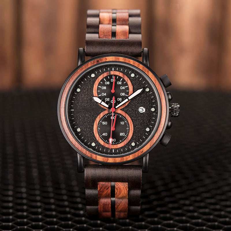 The deep wood grain and dark steel frame its restrained red chronograph details—never loud, always deliberate.